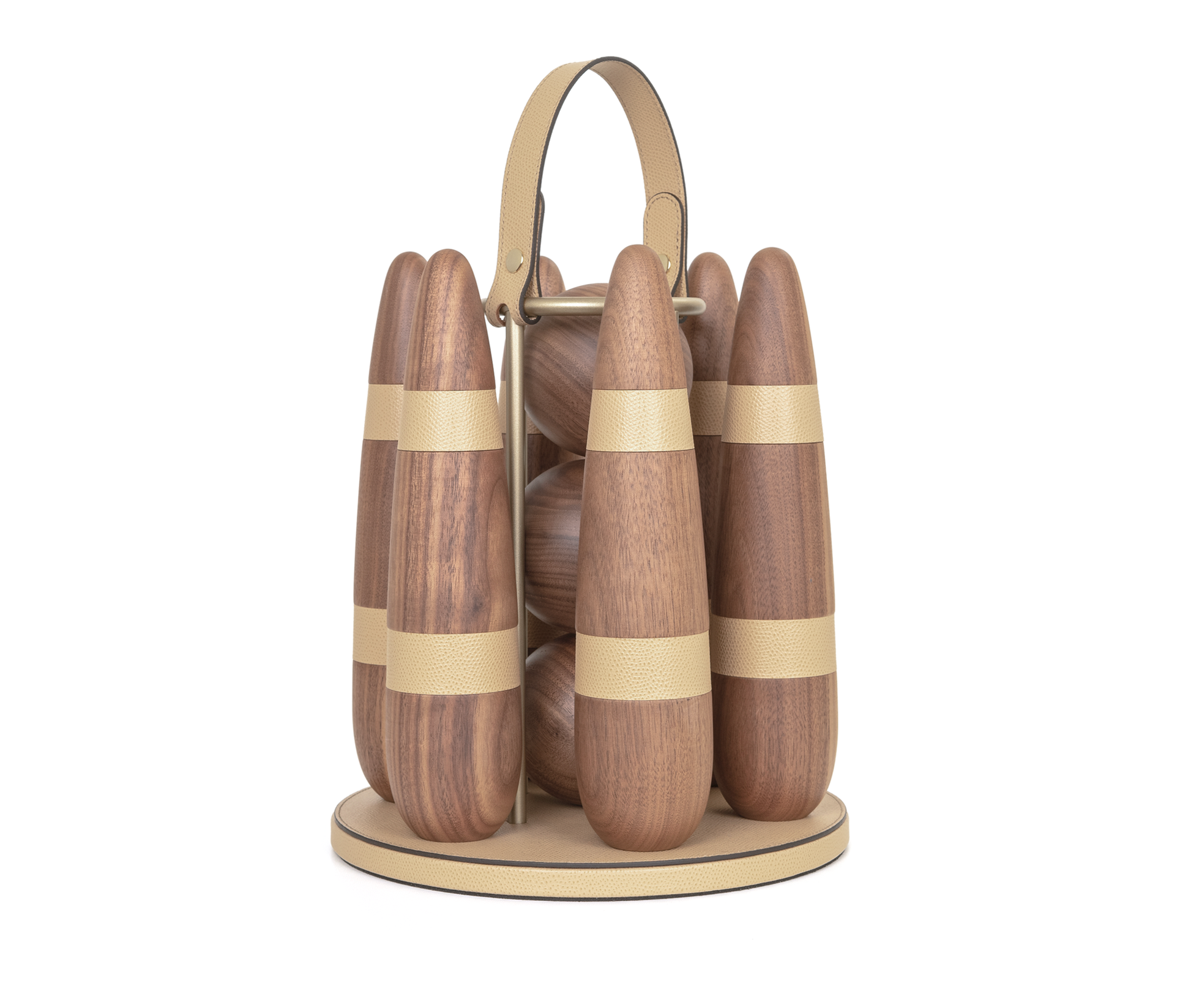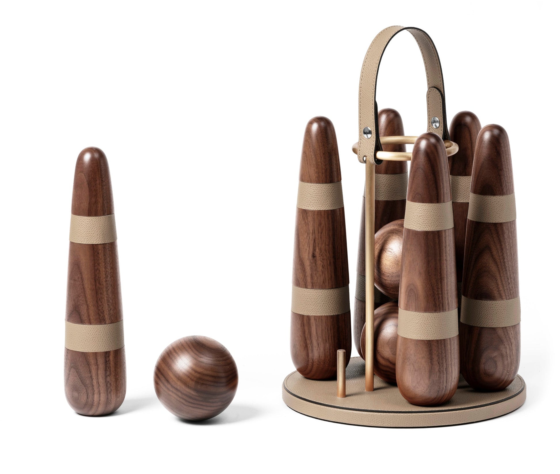 Bring the charm of timeless leisure into your home with the Pinetti Bowling Set, a luxurious reinterpretation of a classic game. Masterfully handcrafted in Italy from fine Canaletto walnut wood, this elegant set is accentuated with leather details and satin brass finishes, making it as beautiful to display as it is enjoyable to play. Designed for both adults and children, this portable indoor bowling set includes three precision-crafted balls and six sleek, modern pins — all housed in a refined, compact format that embodies the artistry and sophistication synonymous with Pinetti.