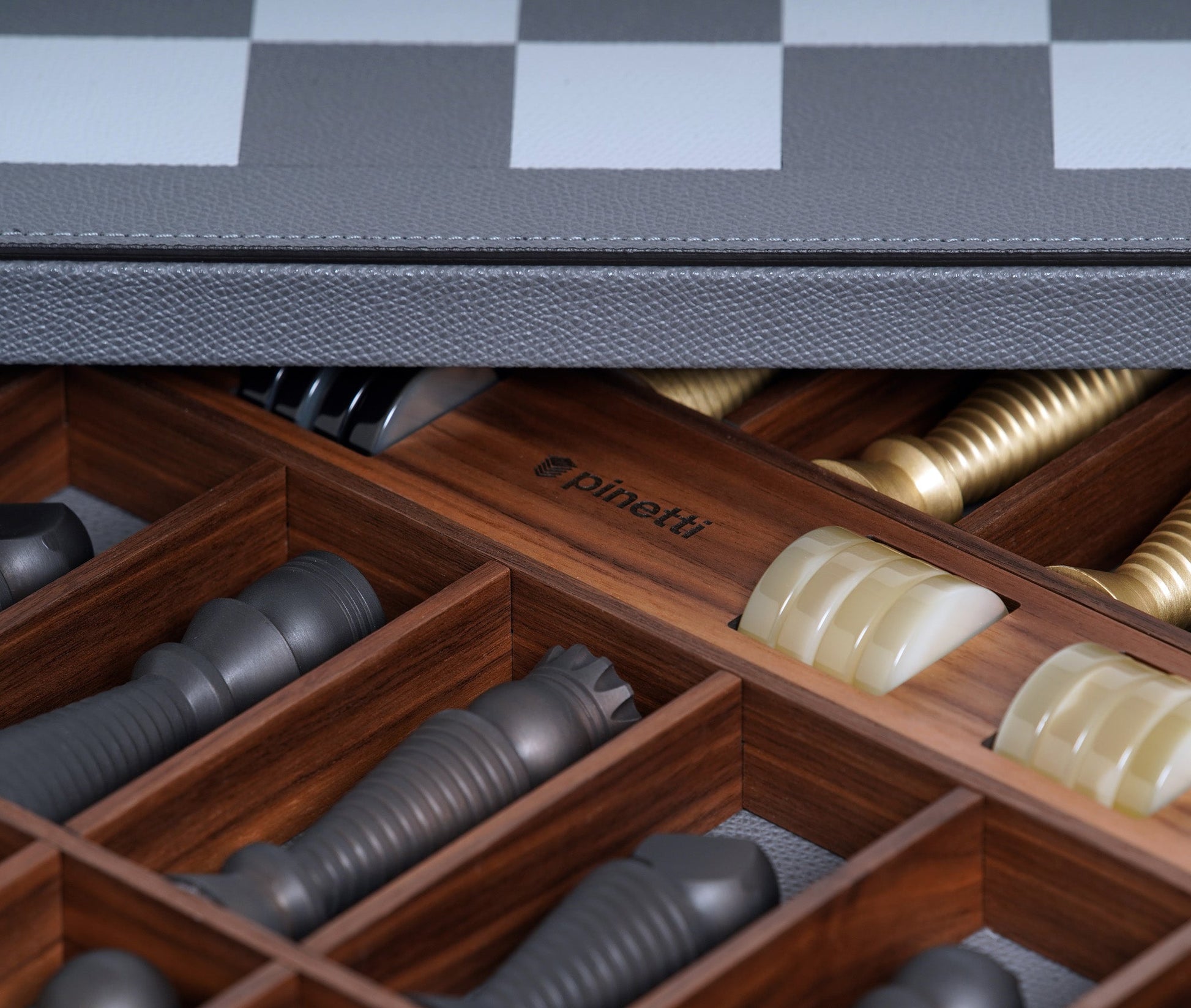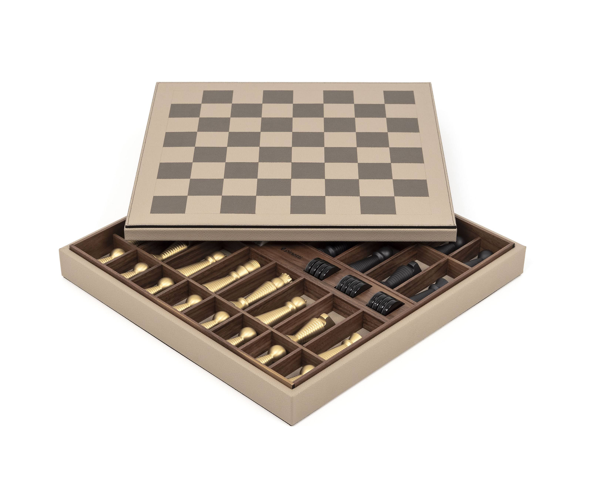 Experience timeless elegance and entertainment with the Pinetti Chess & Checkers Game Board — a sophisticated two-in-one game set that embodies the essence of Italian craftsmanship. Beautifully crafted from walnut wood and genuine leather, this luxurious bicolour board conceals an interior storage tray that holds pearled checkers and black and brass-finished chess pieces. Both a functional game and a decorative statement piece, it brings refinement, warmth, and classic leisure to any living space.